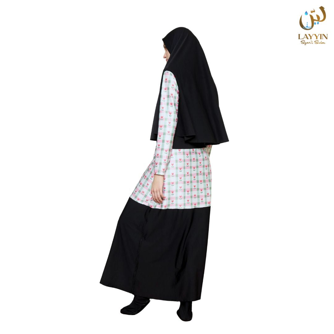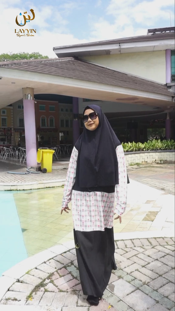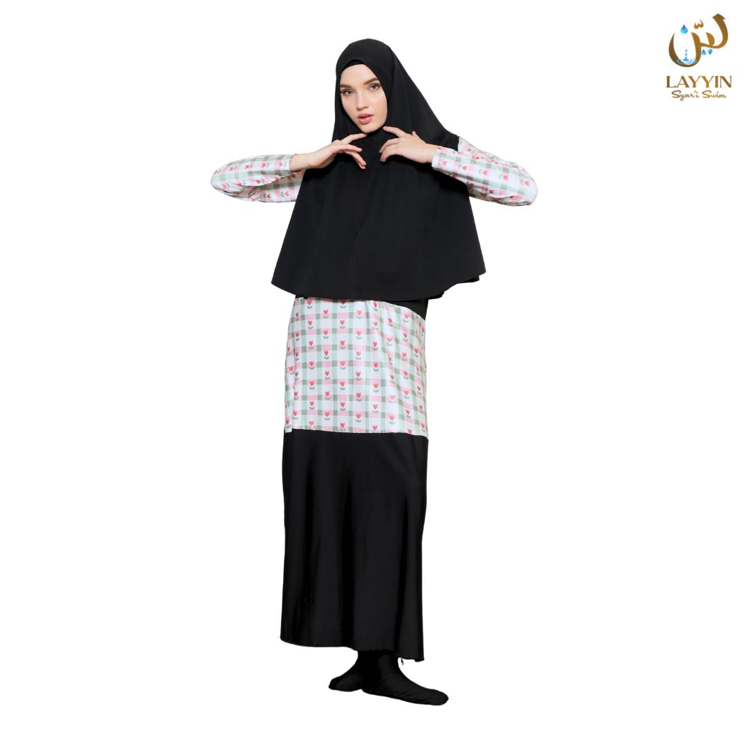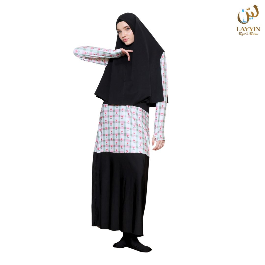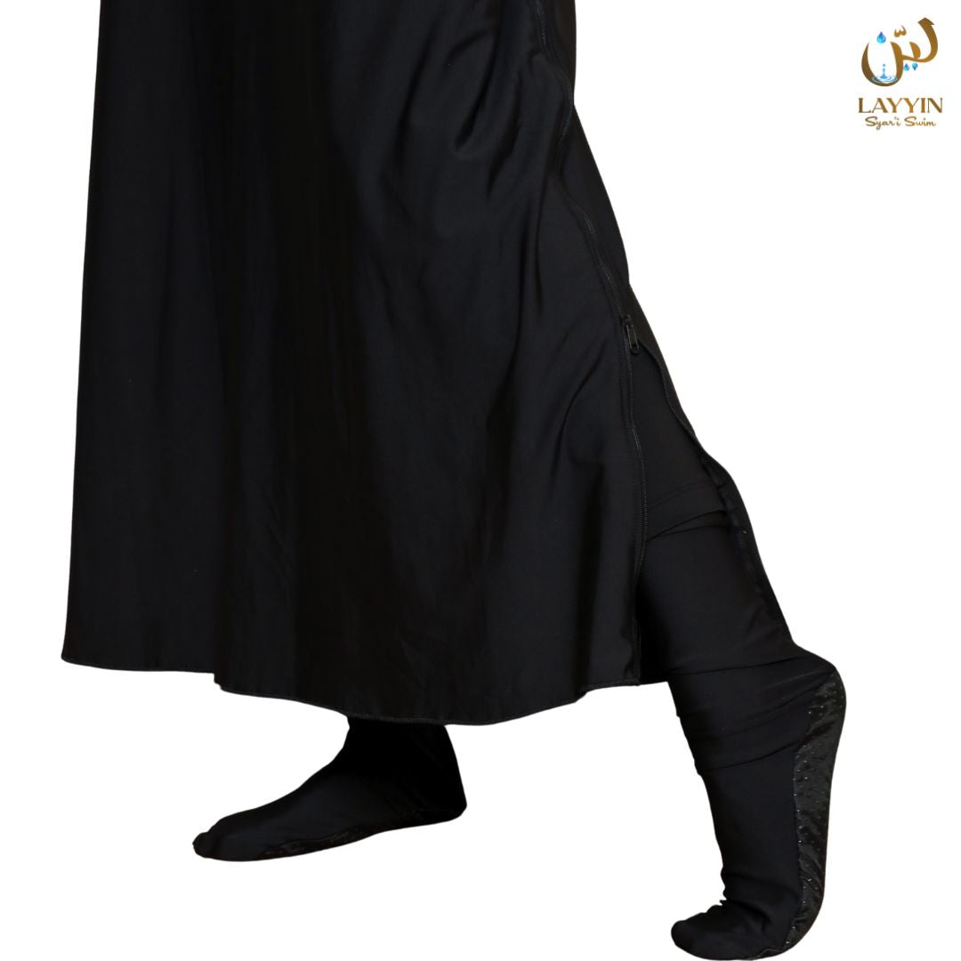 Skirt fabric is Layyin’s custom premium material, specially produced at the factory and not available elsewhere. Proven not to cling to the legs even when wet (same as ModestWave hijab).